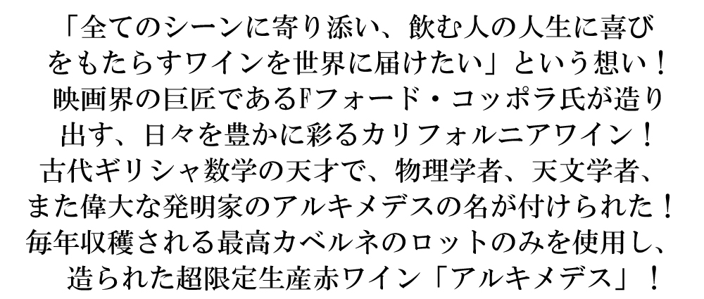 トフィーや深煎りコーヒーのような強いアロマ!リッチで滑らかなタンニンが、タバコ、リコリス、クローヴ、カシス、キャラメル、瑞々しいプラムなどの複雑な香りを引き立たせている!これらの全ての要素が、魅力的で洗練された複雑味を生み出している素晴らしい出来栄え!コッポラ・ワイナリーが誇る最高峰カベルネ“アルキメデス”が限定で少量入荷!ラベルには偉人アルキメデスが鏡を使った熱光線によりローマ軍を撃退した様子が描かれています!