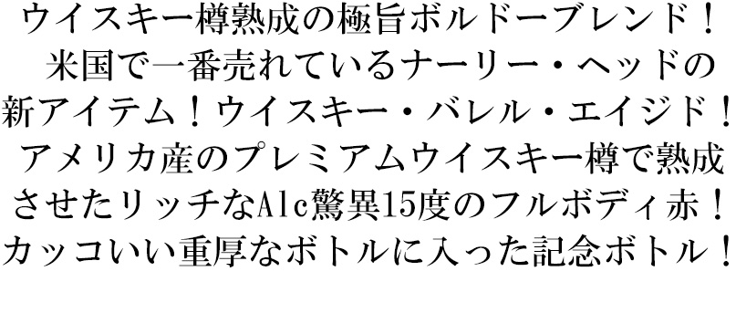 このワインは、アメリカ産のプレミアム・ウイスキー樽で熟成させたリッチな赤ワイン!バランスの取れた酸味とふくよかなタンニン、甘く余韻の長いオークのフィニッシュを持つアルコール度数15度の極旨フルボディ辛口赤ワイン!ウイスキー樽でさらに進化した“ナーリー・ヘッド”が記念ボトルで遂に超限定入荷!