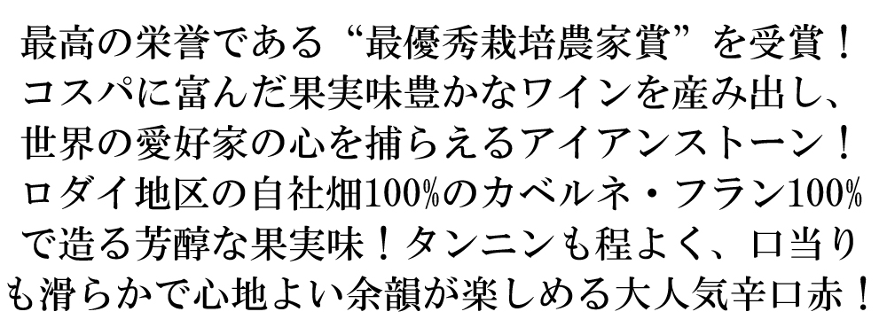 サステナブル農法の完熟したカベルネ・フラン100%をフレンチオーク樽6ヶ月熟成で造られる大人気辛口赤ワイン!軽やかなスパイス香から始まり、心地よい静かなハーブ香!