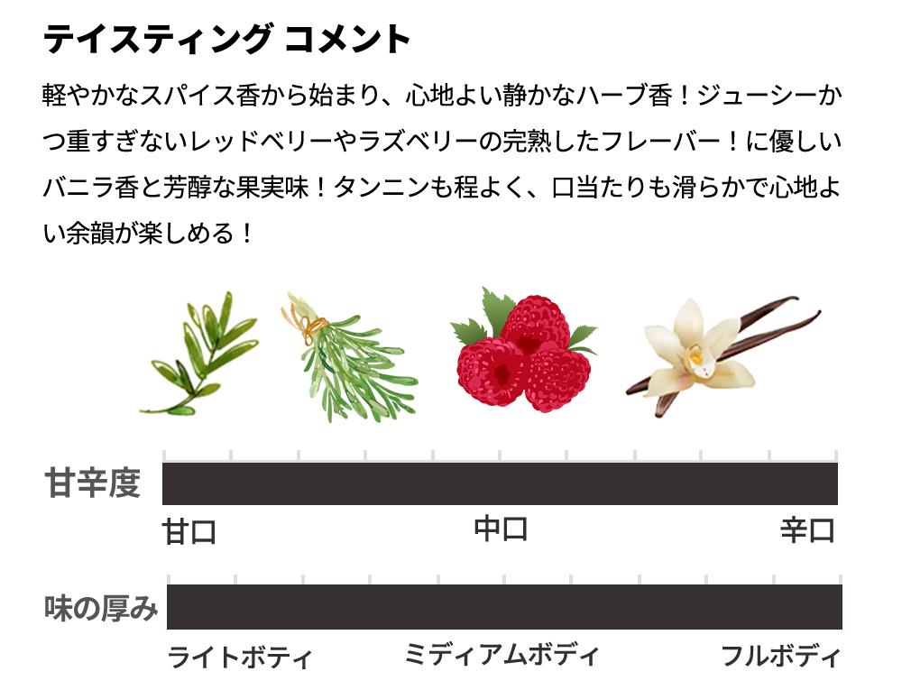 ジューシーかつ重すぎないレッドベリーやラズベリーの完熟したフレーバー!に優しいバニラ香と芳醇な果実味!タンニンも程よく、口当たりも滑らかで心地よい余韻が楽しめるアロマティック・カベルネ・フランが待望入荷!
