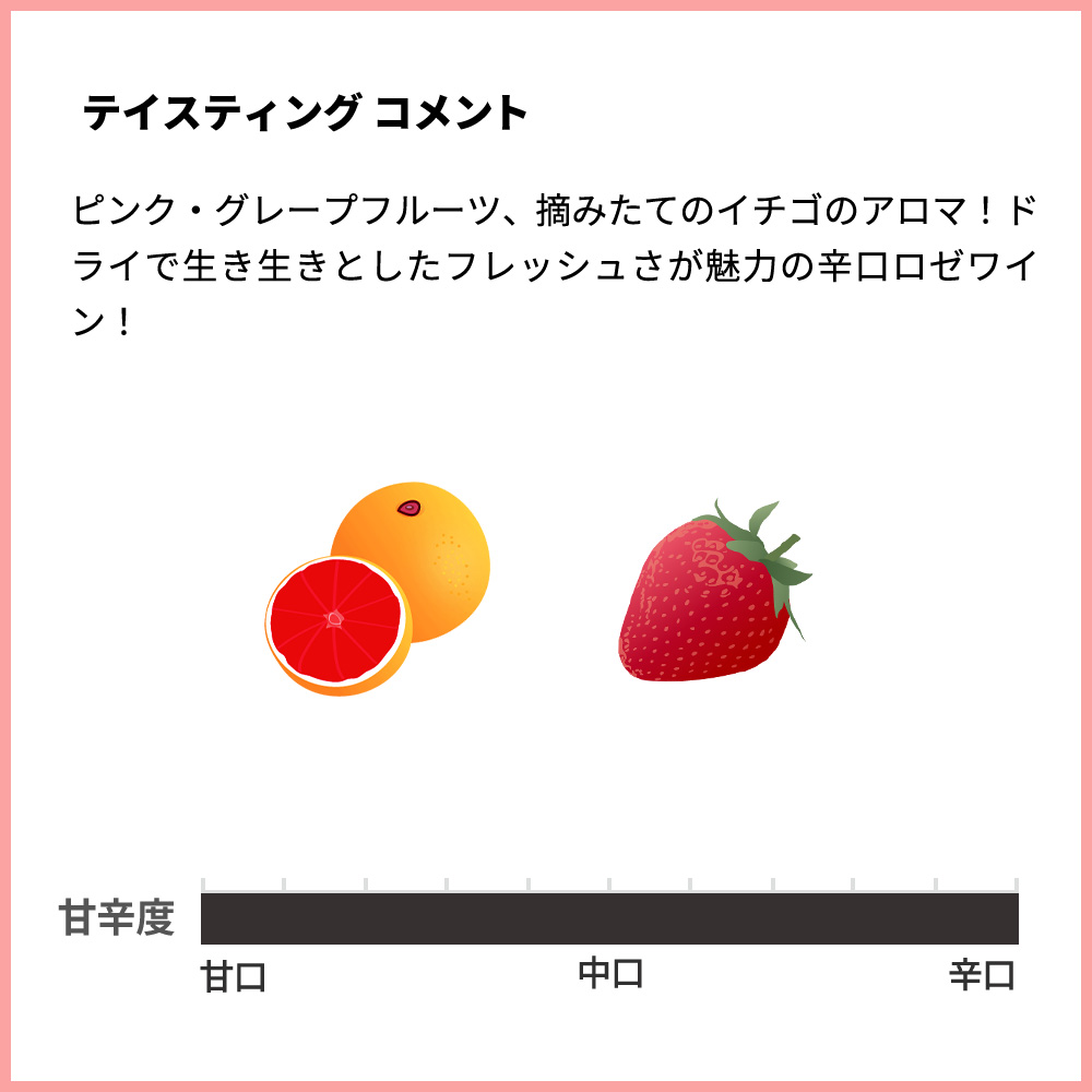 ピンク・グレープフルーツ、摘みたてのイチゴのアロマが特徴で、ドライで生き生きとしたフレッシュさが魅力の辛口ロゼワインだ。