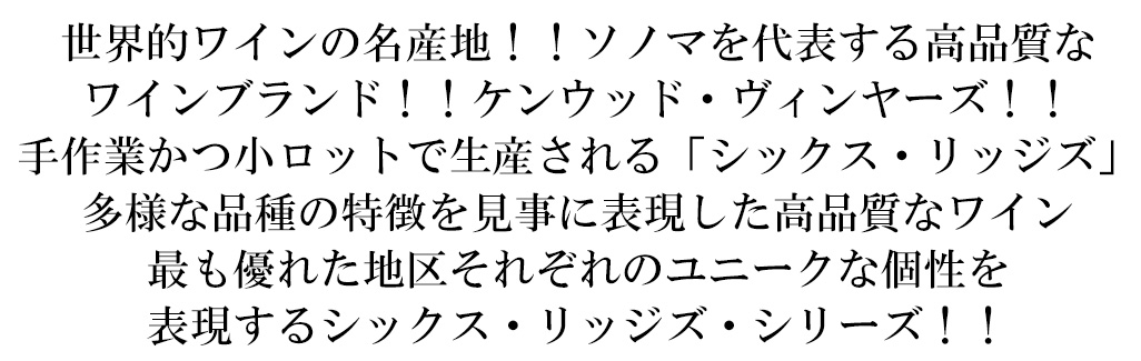 ブドウ畑のテロワールに影響を与える隣接した山々や尾根に敬意を表した、ソノマで、最も優れた地区それぞれのユニークな個性を表現するシリーズ!!シックス・リッジズ・シリーズ!!