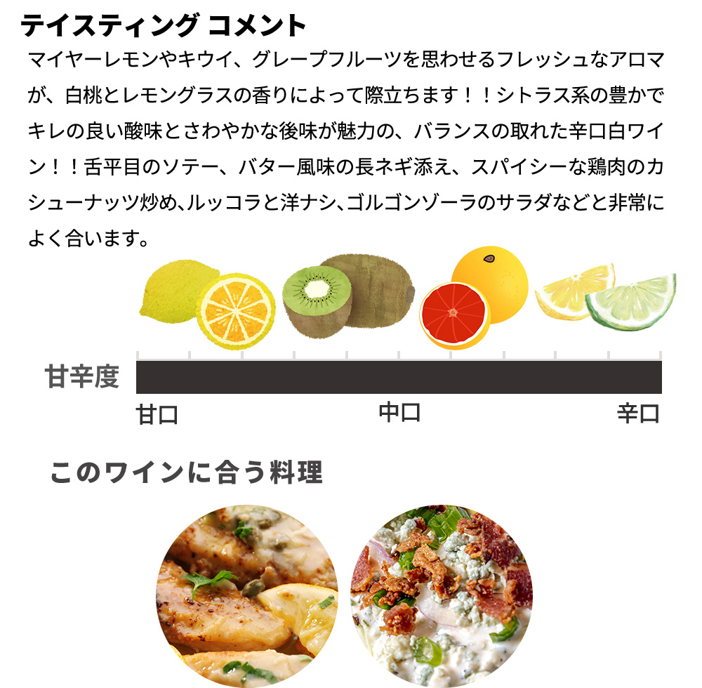 マイヤーレモンやキウイ、グレープフルーツを思わせるフレッシュなアロマが、白桃とレモングラスの香りによって際立ちます!!シトラス系の豊かでキレの良い酸味とさわやかな後味が魅力の、バランスの取れた辛口白ワイン!!