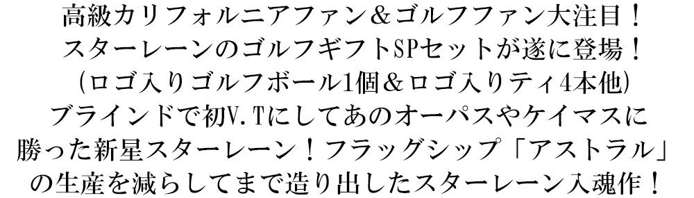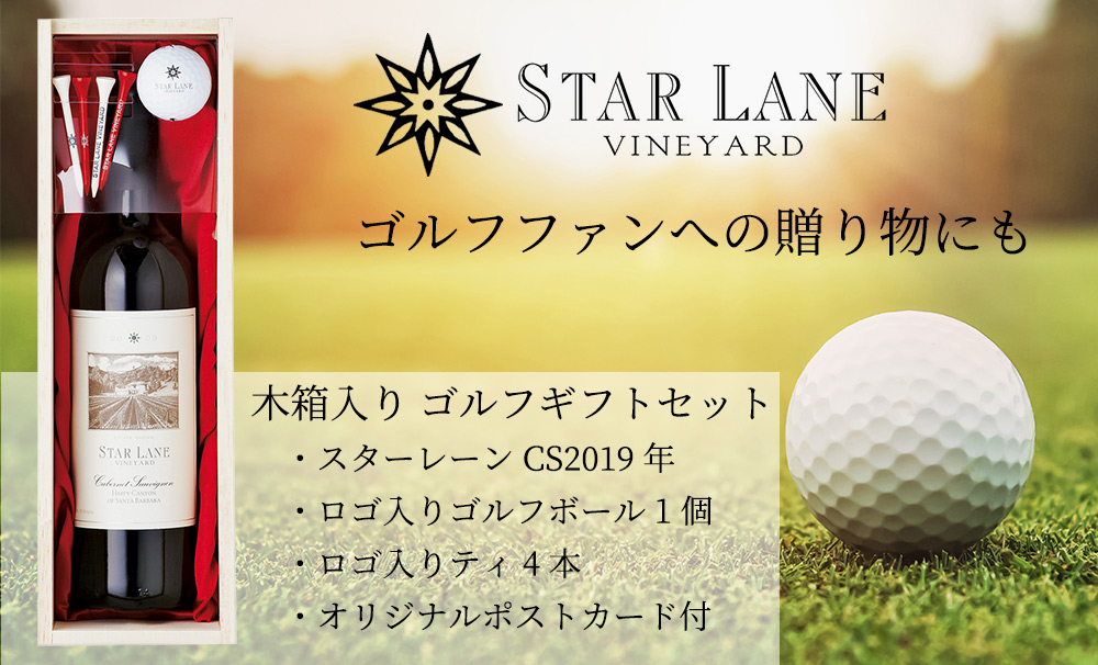 スターレーンのワインは、過去にはマスターズが開催されるゴルフの聖地「オーガスタ」で提供されてきた実績があり、ゴルフと深い関係があります!今回、ゴルフギフトセット(スターレーンCS2019年1本&ロゴ入りゴルフボール1個&ロゴ入りティ4本&オリジナルポストカード付)木箱入りで登場!ゴルフファンへの贈り物にも最適です!