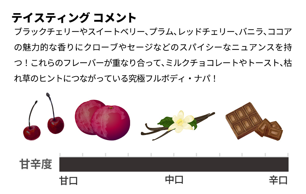 ブラックチェリーやスイートベリー、プラム、レッドチェリー、バニラ、ココアの魅力的な香りにクローブやセージなどのスパイシーなニュアンスを持つ!これらのフレーバーが重なり合って、ミルクチョコレートやトースト、枯れ草のヒントにつながっている究極フルボディ・ナパ!