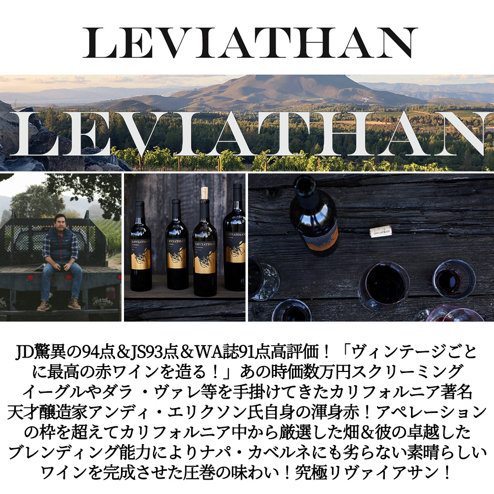 アぺレーションの枠を超えてカリフォルニア中から厳選した畑&彼の卓越したブレンディング能力によりナパ・カベルネにも劣らない素晴らしいワインを完成させた究極リヴァイアサン(アルコール度数14.8%)の究極カリフォルニア・フルボディ辛口赤ワインが待望の限定入荷!