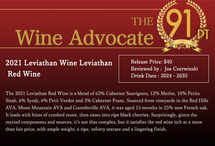 さらにジェームス・サックリング93点で「ブルーベリー、ブラックベリー、花。若干の石。スペアミントとフレッシュなローリエ。ミディアムからフルボディで、ジューシーなタンニンが幾重にも重なり、まろやかでテクスチャーがある。クリーミーで撫でるような味わい。カベルネ・ソーヴィニヨン63%、カベルネ・フラン、プティ・シラー、プティ・ヴェルド、メルロ。」ワインアドヴォケイト誌91点でコメントは「2021年リヴァイアサン・レッド・ワインは、カベルネ・ソーヴィニヨン63%、メルロ12%、プティット・シラー10%、シラー6%、プティ・ヴェルド6%、カベルネ・フラン3%のブレンド。レッド・ヒルズAVA、ムーン・マウンテンAVA、クームスヴィルAVAの畑のブドウを使用し、25%新樽のフレンチオークで15ヶ月熟成。砕石のニュアンスで始まり、熟したブラックチェリーへと続く。意外なことに、無数の構成要素と産地を考えると、それほど複雑ではないが、十分な重さ、熟したビロードのような舌触り、余韻の長いフィニッシュで、適正価格以上の赤ワインの痒みを満たしてくれる。」