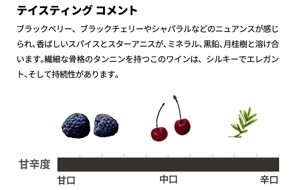 ■ぶどう品種:カベルネ・ソーヴィニヨン63%、メルロ12%、プティ・シラー10%、シラー6%、プティ・ヴェルド6%、カベルネ・フラン3%