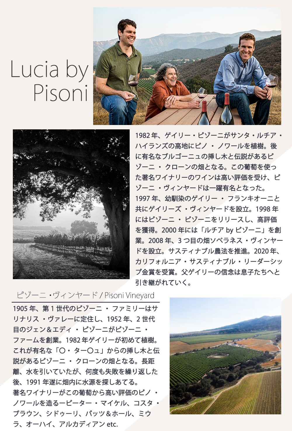 ルチア by ピゾーニ(ピゾーニ・ファミリー・ヴィンヤーズ)・シラー・ソベラネス・ヴィンヤード・サンタ・ルチア・ハイランズ[2022]年・ ルチア・バイ・ピゾーニ・AVAサンタ・ルチア・ハイランズ・アルコール度数14.1%・ワインメーカー ジェフ・ピゾーニ氏