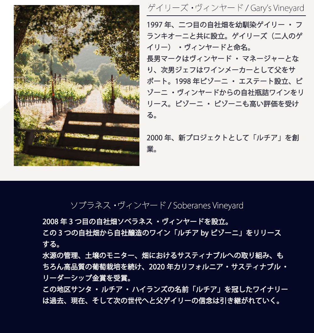 カリフォルニア愛好家垂涎!シラー愛好家大注目!ピノ・ノワール&シャルドネで愛好家を魅了し、著名ワイナリーのブドウの供給元にもなっている名門ピゾーニ・ファミリーの主幹ブランド!サンタ・ルチア・ハイランズの3つの自社畑からピゾーニ・ファミリーが造る傑作シラー!ワイナリーについてインポーターさんは「1982年、ゲイリー・ピゾーニがサンタ・ルチア・ハイランズの高地にピノ・ノワールを植樹。後に有名なブルゴーニュの挿し木と伝説があるピゾーニ・クローンの畑となる。この葡萄を使った著名ワイナリーのワインは高い評価を受け、ピゾーニ・ヴィンヤードは一躍有名となった。1997年、幼馴染のゲイリー・フランキオーニと共にゲイリーズ・ヴィンヤードを設立。1998年にはピゾーニ・ピゾーニをリリースし、高評価を獲得。2000年には「ルチアbyピゾーニ」を創業。2008年、3つ目の畑ソベラネス・ヴィンヤードを設立。サスティナブル農法を推進。2020年、カリフォルニア・サスティナブル・リーダーシップ金賞を受賞。父ゲイリーの信念は息子たちへと引き継がれていく。1.ピゾーニ・ヴィンヤード:1905年、第1世代のピゾーニ・ファミリーはサリナリス・ヴァレーに定住し、1952年、2世代目のジェン&エディ・ピゾーニがピゾーニ・ファームを創業。1970年代、息子のゲイリーはワインに情熱を注ぎ、自宅ガレージでワイン造りを始めた。モントレー湾からの冷たい霧とブルゴーニュと同じ朝日を享受できる東向き斜面。ここに水源さえ見つければ最高のワインを造ることができるという信念の元、1979年、サンタ・ルチア・ハイランズの最南端に近い標高300~400mの高地に土地を購入。1982年ゲイリーが初めて植樹。これが有名な「〇・ター〇ュ」からの挿し木と伝説があるピゾーニ・クローンの畑となる。長距離、水を引いていたが、何度も失敗を繰り返した後、1991年遂に畑内に水源を探しあてる。著名ワイナリーがこの葡萄から高い評価のピノ・ノワールを造るーピーター・マイケル、コスタ・ブラウン、シドゥーリ、パッツ&ホール、ミウラ、オーハイ、アルカディアンなど。2.ゲイリーズ・ヴィンヤード:1997年、二つ目の自社畑を幼馴染ゲイリー・フランキオーニと共に設立。ゲイリーズ(二人のゲイリー)・ヴィンヤードと命名。長男マークはヴィンヤード・マネージャーとなり、次男ジェフはワインメーカーとして父をサポート。1998年ピゾーニ・エステート設立、ピゾーニ・ヴィンヤードからの自社瓶詰ワインをリリース。ピゾーニ・ピゾーニも高い評価を受ける。2000年、新プロジェクトとして「ルチア」を創業。3.ソブラネス・ヴィンヤード:2008年3つ目の自社畑ソベラネス・ヴィンヤードを設立。この3つの自社畑から自社醸造のワイン「ルチアbyピゾーニ」をリリースする。水源の管理、土壌のモニター、畑におけるサスティナブルへの取り組み、もちろん高品質の葡萄栽培を続け、2022年カリフォルニア・サスティナブル・リーダーシップ金賞を受賞。この地区サンタ・ルチア・ハイランズの名前「ルチア」を冠したワイナリーは過去、現在、そして次の世代へと父ゲイリーの信念は引き継がれていく。」この「ルチア by ピゾーニ・シラー・ソベラネス・ヴィンヤード サンタ・ルチア・ハイランズ[2022]年」は、ずばりソベラネス・ヴィンヤードからの砂質ローム層の土壌に巨石が地中に埋まる土壌からのシラー種100%を手摘み100%!100%全房発酵(天然酵母使用)!フレンチオーク樽17ヶ月熟成(新樽比率35%)で造られるフルボディ辛口赤ワイン!2022年についてワイナリーは「2022年のサンタ・ルチア・ハイランズは、冬の雨が前年までの乾燥した畑に潤いを与え、春から夏にかけて乾燥した穏やかな天候が続いた。9月初旬の猛暑により、畑での生育を頻繁に確認し収穫時期を早めることになったが、その判断が功を奏し、全てのブロックを希望通りの完熟のタイミングで別々に収穫を行い、平均よりも凝縮度が高く、生き生きとしたアロマを持つ葡萄となった。」深いルビー色から濃い紫色までの色調を持ち、良く言われるオールド・ワールドとニュー・ワールドの両方の特徴を持つ!ニュー・ワールドの明るい日差しが、芳醇なダーク・ベリー、砕いたスミレ、鉱物的な黒鉛の香をもたらす一方、太平洋からの冷涼な沿岸の空気が、オールド・ワールドのニュアンスである燻製肉、ドライ・ハーブアニスなどのスパイシーな個性と繊細さをもたらす!ブラックベリーのジャム、ジューシーな黒すぐり、甘草の根の甘美な香りが濃厚で広がり、ダークチョコレートと挽きたてのコーヒーの風味が香ばしい印象を与えている!非常に骨格のしっかりしたシラーで、高貴なタンニンと明確なミネラル感で引き締められている!抜栓後空気に触れることで、隠れていた様々な味わいが幾重にも解き放たれる!デカンタをお勧めします!ソベラネス・ヴィンヤードの個性が満載の傑作シラーが限定で少量入荷!