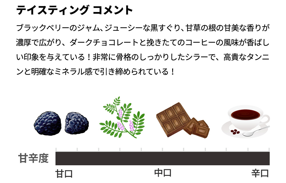 深いルビー色から濃い紫色までの色調を持ち、良く言われるオールド・ワールドとニュー・ワールドの両方の特徴を持つ!ニュー・ワールドの明るい日差しが、芳醇なダーク・ベリー、砕いたスミレ、鉱物的な黒鉛の香をもたらす一方、太平洋からの冷涼な沿岸の空気が、オールド・ワールドのニュアンスである燻製肉、ドライ・ハーブアニスなどのスパイシーな個性と繊細さをもたらす!ブラックベリーのジャム、ジューシーな黒すぐり、甘草の根の甘美な香りが濃厚で広がり、ダークチョコレートと挽きたてのコーヒーの風味が香ばしい印象を与えている!非常に骨格のしっかりしたシラーで、高貴なタンニンと明確なミネラル感で引き締められている!抜栓後空気に触れることで、隠れていた様々な味わいが幾重にも解き放たれる!デカンタをお勧めします!ソベラネス・ヴィンヤードの個性が満載の傑作シラーが限定で少量入荷!