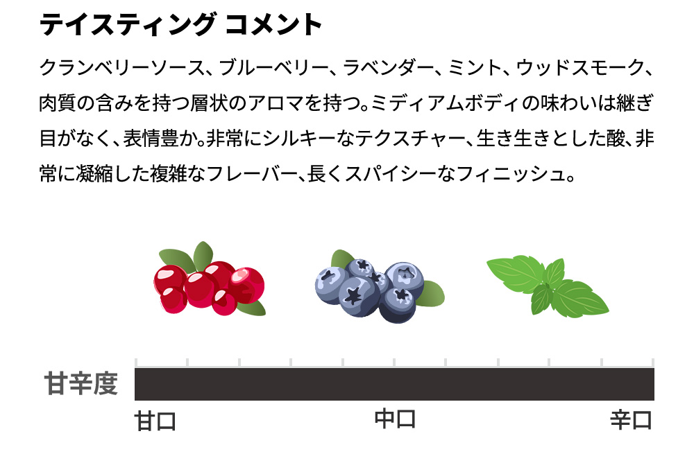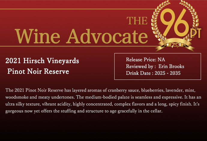 ワインアドヴォケイト誌驚異の96点でコメントは「2021年のピノ・ノワール・リザーヴは、クランベリーソース、ブルーベリー、ラベンダー、ミント、ウッドスモーク、肉質の含みを持つ層状のアロマを持つ。ミディアムボディの味わいは継ぎ目がなく、表情豊か。非常にシルキーなテクスチャー、生き生きとした酸、非常に凝縮した複雑なフレーバー、長くスパイシーなフィニッシュ。今飲んでもゴージャスだが、セラーで優雅に熟成させるだけの詰め物とストラクチャーを備えている。」と高評価!さらにジェームス・サックリング98点!ヴィノス誌97点高評価!