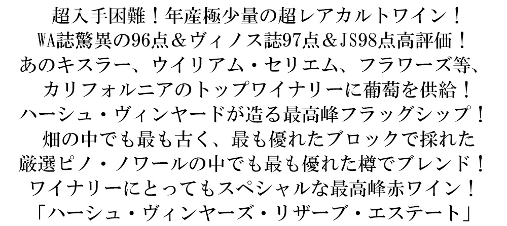 全米の有名レストランもこぞってオンリストし、あのオバマ大統領も行きつけのレストランで愛飲している、お気に入りのワイナリーで、かつてはカルトワインのキスラーやフラワーズ、ウイリアム・セリエムなどのブドウの供給元だった名門ハーシュ・ヴィンヤーズの最高峰赤ワイン“リザーブ・エステート・ピノ・ノワール”!高評価続出[2021]年ものが、正規代理店輸入品で限定で極少量入荷!