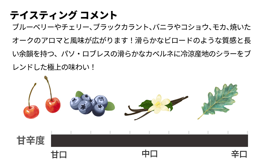 ブルーベリーやチェリー、ブラックカラント、バニラやコショウ、モカ、焼いたオークのアロマと風味が広がります!滑らかなビロードのような質感と長い余韻を持つ、パソ・ロブレスの滑らかなカベルネに冷涼産地のシラーをブレンドした極上の味わい!