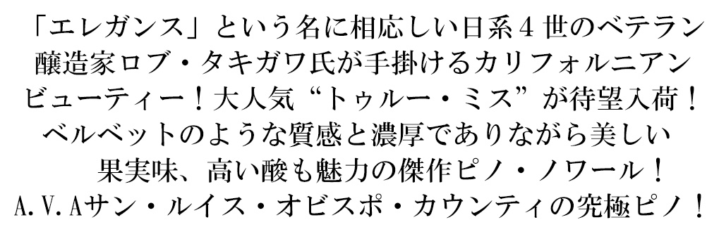滑らかな質感と美しい果実味、高い酸も魅力の傑作ピノ・ノワール!日系4世の匠ロブ・タキガワ氏渾身の究極ピノ・ノワールが限定で少量入荷!