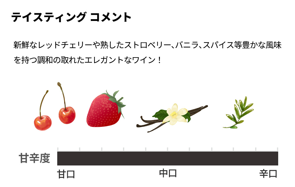 新鮮なレッドチェリーや熟したストロベリー、バニラ、スパイス等豊かな風味を持つ調和の取れたエレガントなワイン!