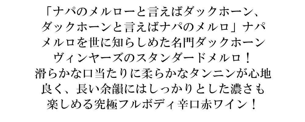 滑らかな口当たりに柔らかなタンニンが心地良く、長い余韻にはしっかりとした濃さも楽しめるナパ・ヴァレーを代表する看板メルロが正規品で待望入荷!