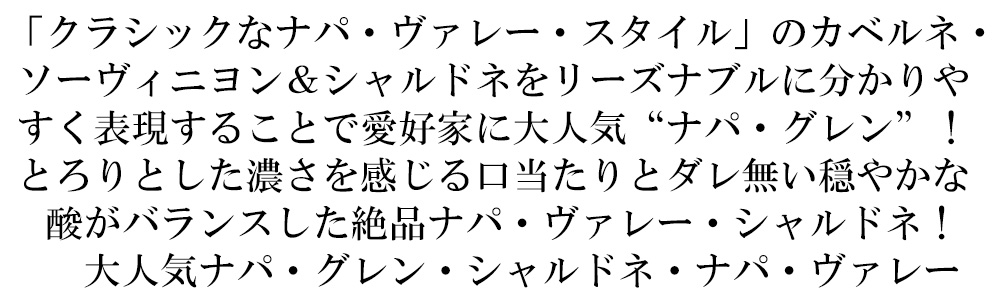 「クラシックなナパ・ヴァレー・スタイル」のカベルネ・ソーヴィニヨン&シャルドネをリーズナブルに分かりやすく表現した大人気“ナパ・グレン”!