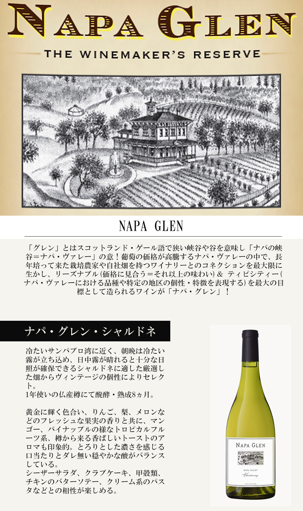 クラシックなナパ・ヴァレー・スタイルで人気を博すナパ・グレン・シャルドネ・ナパ・ヴァレーが正規品で限定で少量入荷!