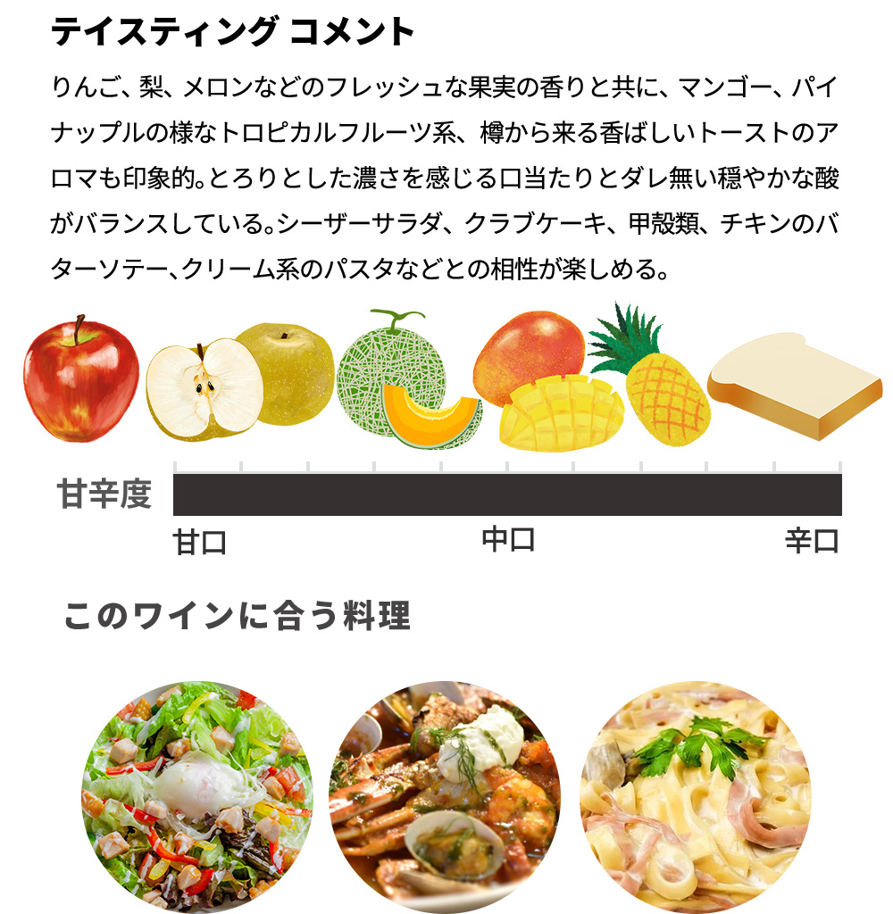 テイスティングコメントは「黄金に輝く色合い、りんご、梨、メロンなどのフレッシュな果実の香りと共に、マンゴー、パイナップルの様なトロピカルフルーツ系、樽から来る香ばしいトーストのアロマも印象的。とろりとした濃さを感じる口当たりとダレ無い穏やかな酸がバランスしている。シーザーサラダ、クラブケーキ、甲殻類、チキンのバターソテー、クリーム系のパスタなどとの相性が楽しめる。」