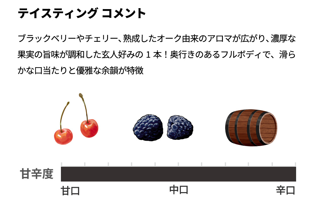 ブラックベリーやチェリー、熟成したオーク由来のアロマが広がり、濃厚な果実の旨味が調和した玄人好みの1本!奥行きのあるフルボディで、滑らかな口当たりと優雅な余韻が特徴のアルコール度数14.5%のフルボディ辛口赤ワイン!