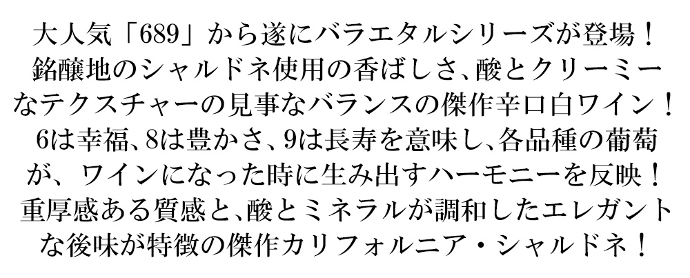 爽やかな柑橘や洋ナシ、パイナップルの香りに、バニラとトーストしたオークが見事に調和!重厚感のある質感と、酸とミネラルが調和したエレガントな後味が特徴!