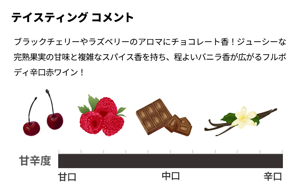 ブラックチェリーやラズベリーのアロマにチョコレート香!ジューシーな完熟果実の甘味と複雑なスパイス香を持ち、程よいバニラ香が広がるフルボディ辛口赤ワインが待望の入荷!