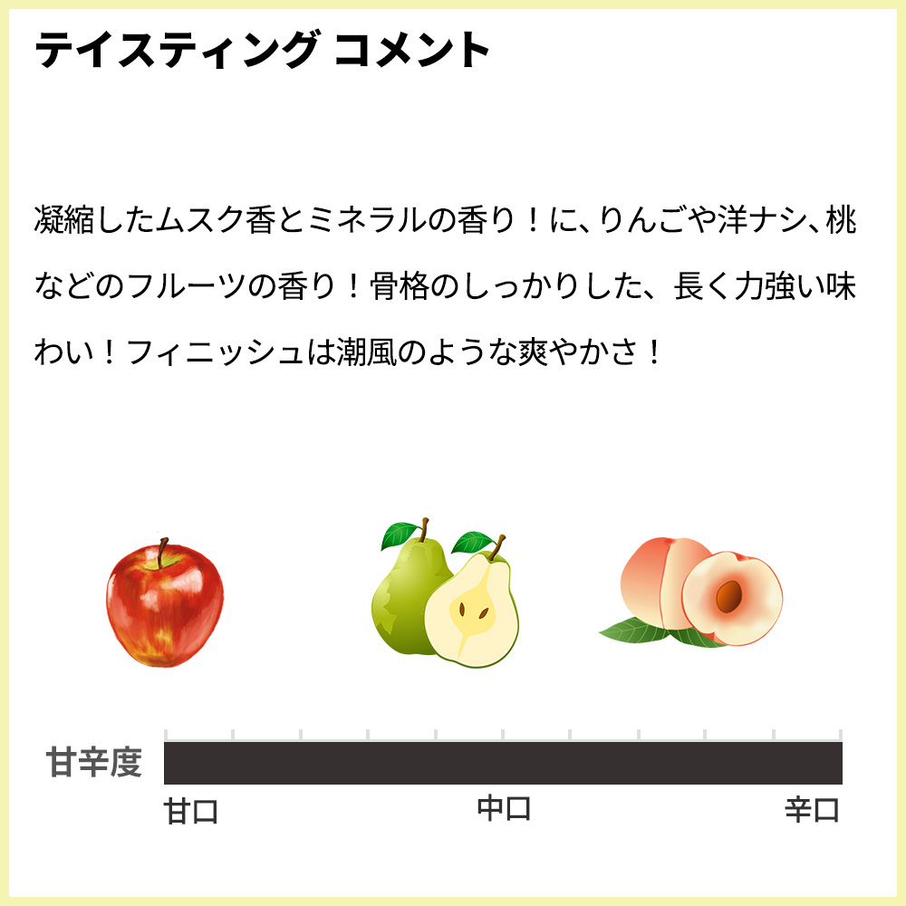 凝縮したムスク香とミネラルの香り!に、りんごや洋ナシ、桃などのフルーツの香り!骨格のしっかりした、長く力強い味わい!フィニッシュは潮風のような爽やかさ!