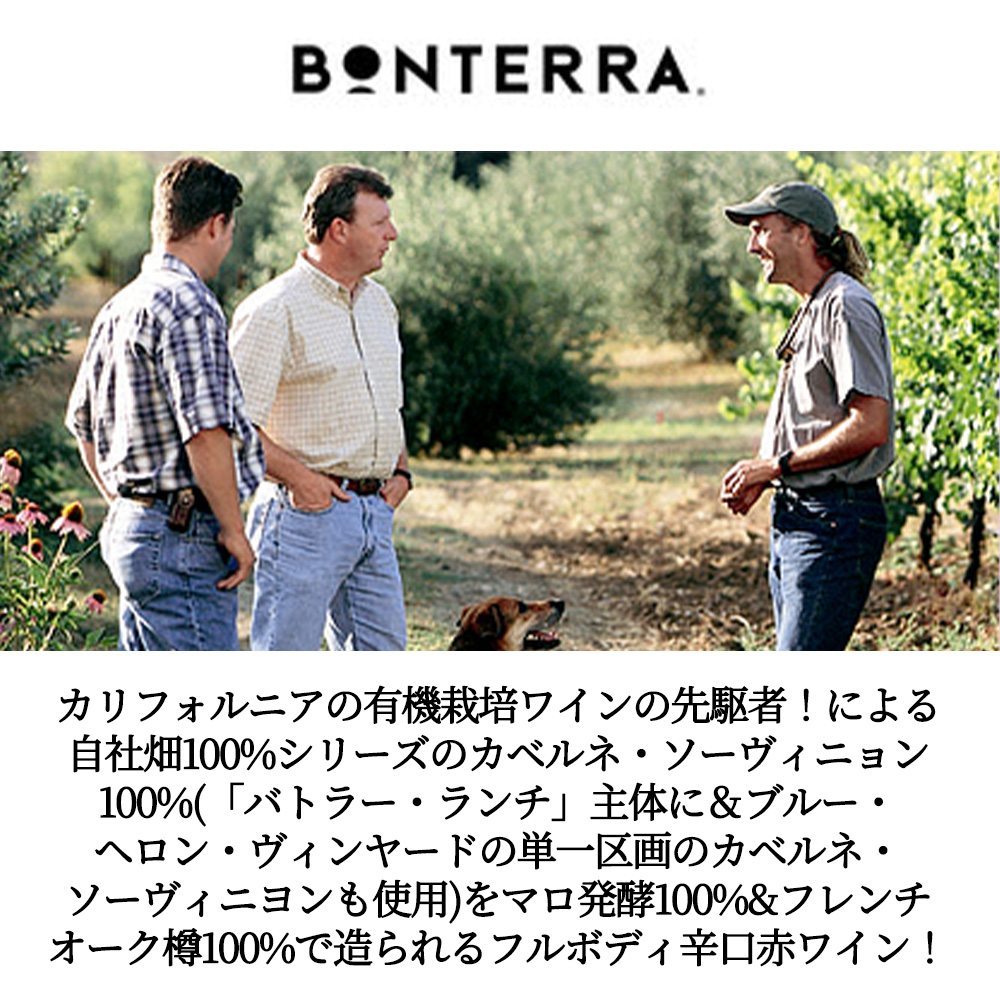 \ボンテッラ・オーガニック・ヴィンヤード・自然派・ビオロジック&オーガニック (CCOF認証) (環境再生型農業 (ROC認証) ) で造られる環境再生型農業認証を得る自社畑100%のブドウを100%使用。ブドウは手摘みで収穫、ステンレスタンクで発酵、マロラクティック発酵の後、フレンチオーク (新樽40%) で6ヶ月間の熟成。究極フルボディ辛口赤ワイン!