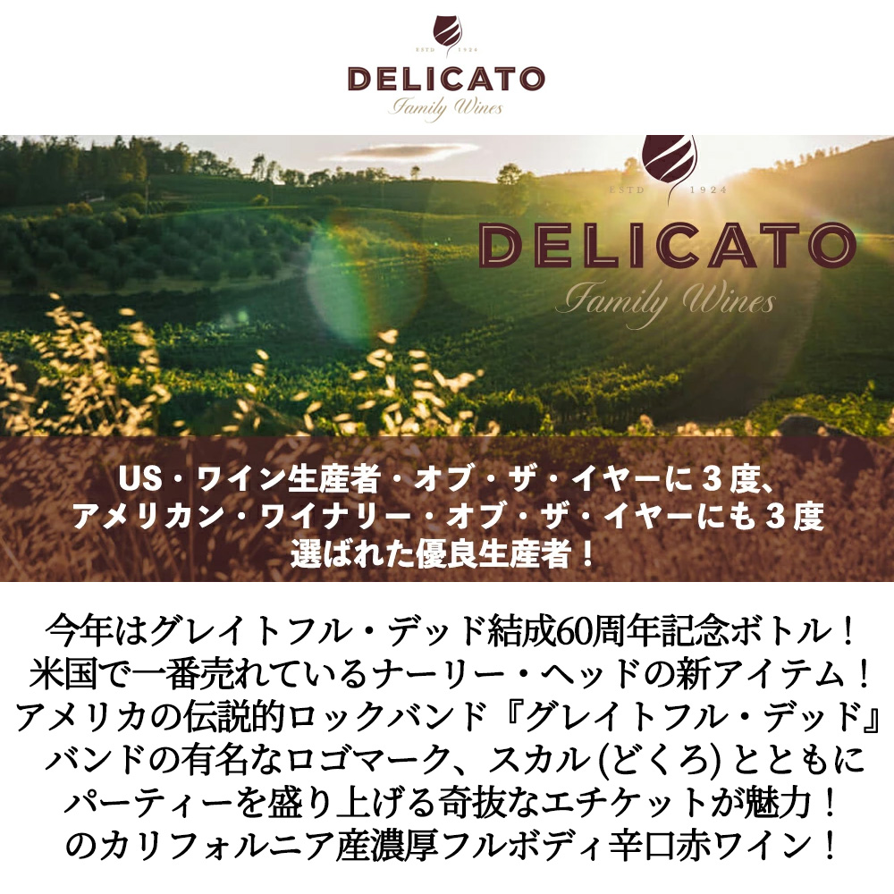 アメリカの伝説的ロックバンド『グレイトフル・デッド』の名を語り、バンドの有名なロゴマーク、スカル(どくろ)とともにパーティーを盛り上げる奇抜なエチケットのカリフォルニア産濃厚フルボディ辛口赤ワイン!