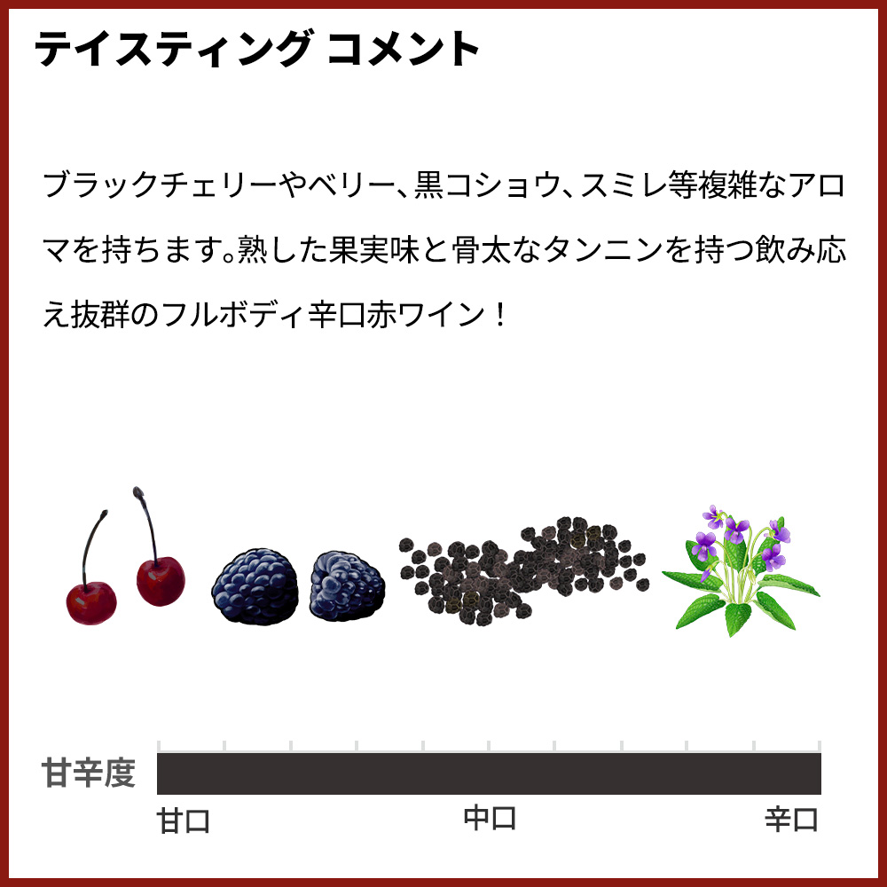 ブラックチェリーやベリー、黒コショウ、スミレ等複雑なアロマを持ちます。熟した果実味と骨太なタンニンを持つ飲み応え抜群のフルボディ辛口赤ワイン!