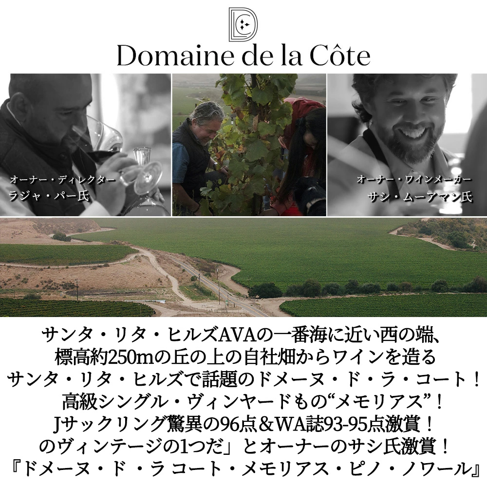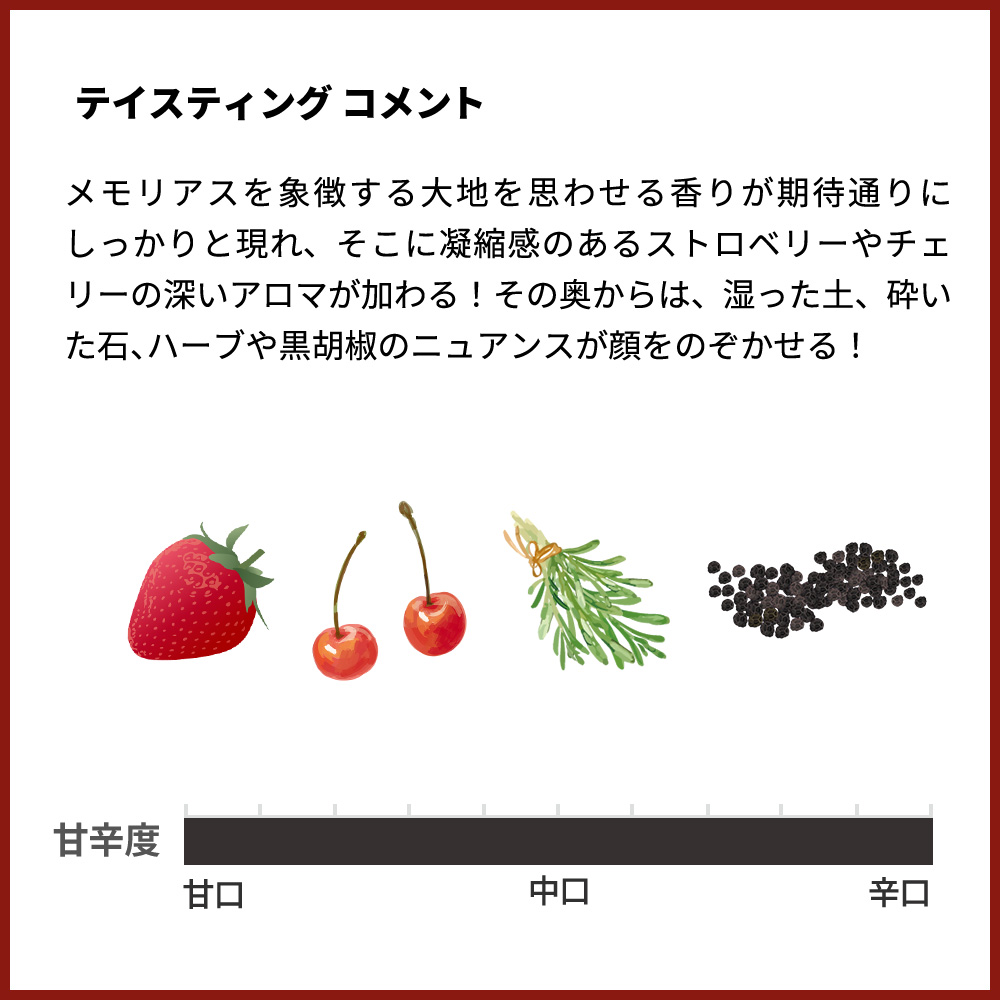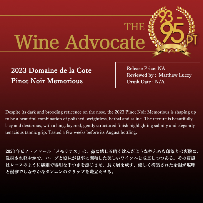 メモリアスを象徴する大地を思わせる香りが期待通りにしっかりと現れ、そこに凝縮感のあるストロベリーやチェリーの深いアロマが加わる!ジャミーではなく、日差しをたっぷり浴びたような豊かさを感じる!その奥からは、湿った土、砕いた石、ハーブや黒胡椒のニュアンスが顔をのぞかせる!全体に溶け込んだ酸とチョーキーな質感が、豊潤な味わいに骨格を与え、贅沢で柔らかなタンニンを引き立てながら、長い余韻へと続くドメーヌ・ド ・ラ コートのシングル・ヴィンヤードもの!ドメーヌ・ド ・ラ コート・メモリアス・ピノ・ノワールが正規品で限定で少量入荷!