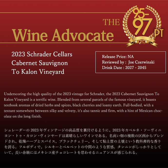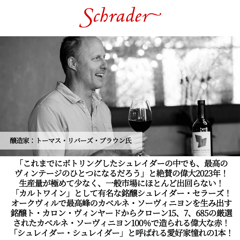 「シュレイダー・シュレイダー」と呼ばれるカベルネ・ソーヴィニヨンは、優れた熟成能力で知られるクローン15、7、685の厳選されたブドウのみ使用!フレンチオーク樽 (ダルナジュー社&タランソ?社) の新樽100%で熟成で造られるアルコール度数15.5%のフルボディ辛口赤ワイン!