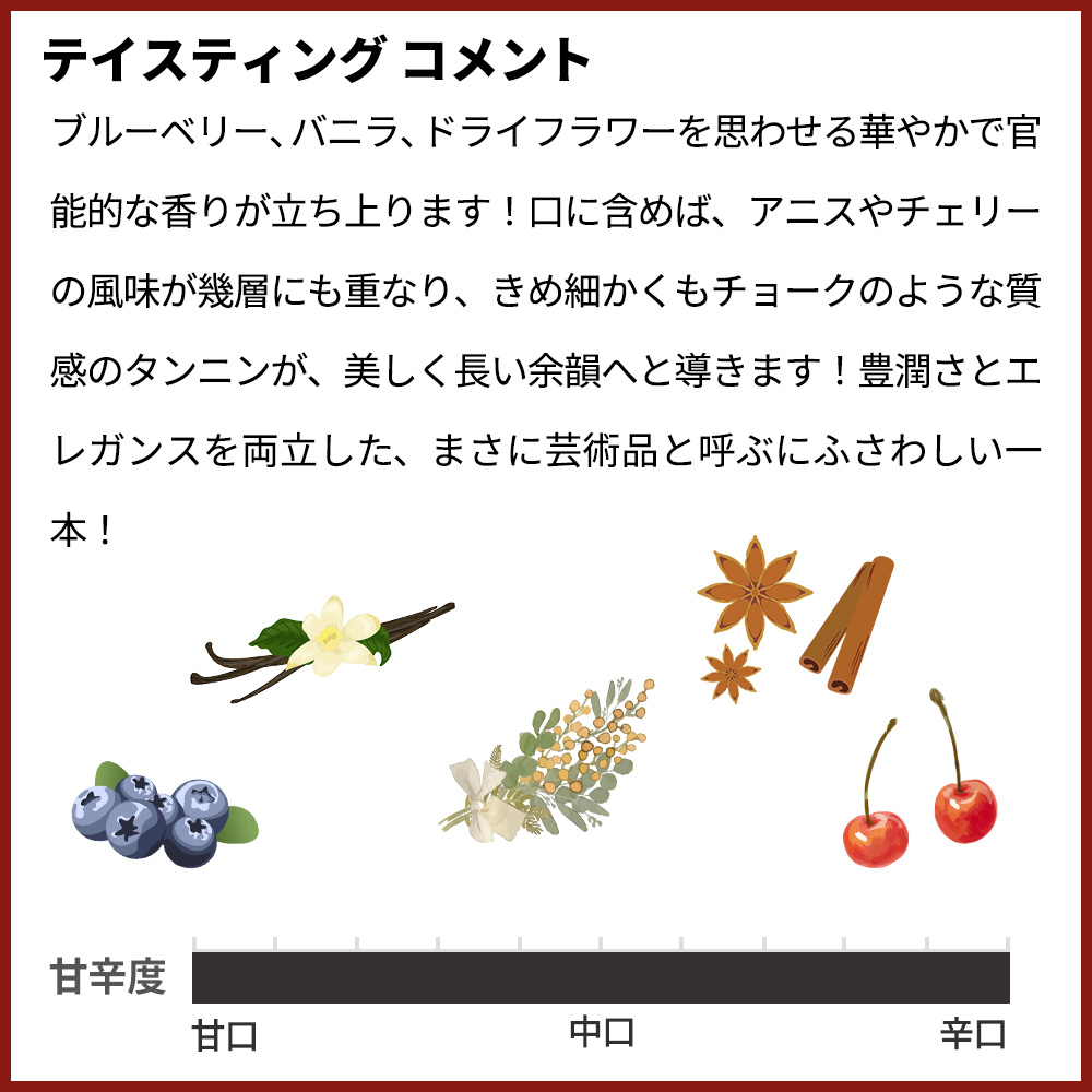 グラスに注ぐと、ブルーベリー、バニラ、ドライフラワーを思わせる華やかで官能的な香りが立ち上ります!口に含めば、アニスやチェリーの風味が幾層にも重なり、きめ細かくもチョークのような質感のタンニンが、美しく長い余韻へと導きます!豊潤さとエレガンスを両立した、まさに芸術品と呼ぶにふさわしい一本!