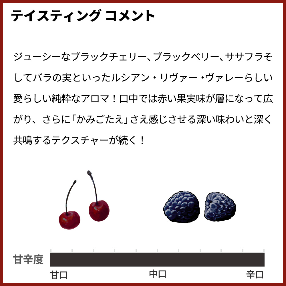 グラスの中で光輝く!ジューシーなブラックチェリー、ブラックベリー、ササフラそしてバラの実といったルシアン・リヴァー・ヴァレーらしい愛らしい純粋なアロマ!口中では赤い果実味が層になって広がり、さらに「かみごたえ」さえ感じさせる深い味わいと深く共鳴するテクスチャーが続く!