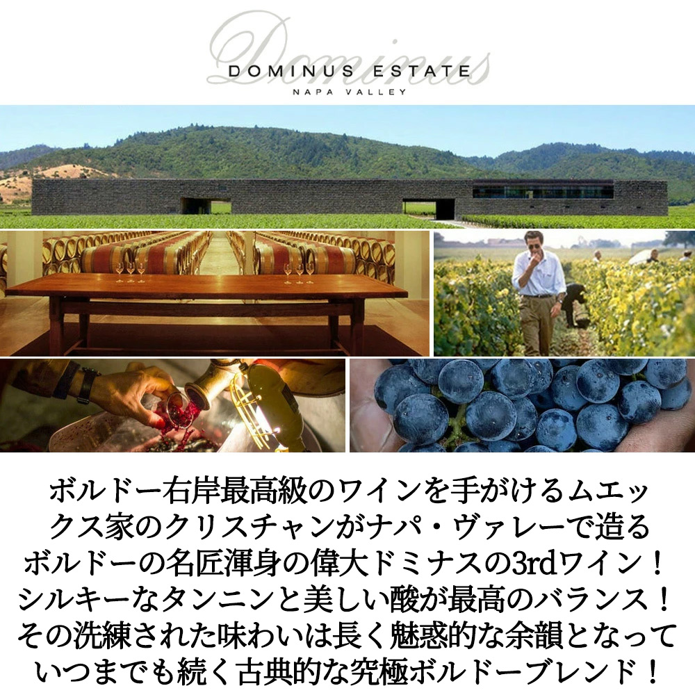 ペトリュス、トロタノワ、オザンナ、ラ・フルール・ペトリュスといったボルドー右岸最上のワインを手がけるクリスチャン・ムエックス氏が手がけるドミナス・エステート。マニファクチュアな雰囲気のドミナスはつくりも緻密で繊細です。 ブドウの品質が良い時にのみ卓越したワインを造ることができる、という信条をもつクリスチャン・ムエックスは、ブドウ造りから瓶詰めまですべてを手掛けています。これはカリフォルニアでも珍しく、伝統と革新と共に、最上を求めるクリスチャン・ムエックスの真髄が感じられます。