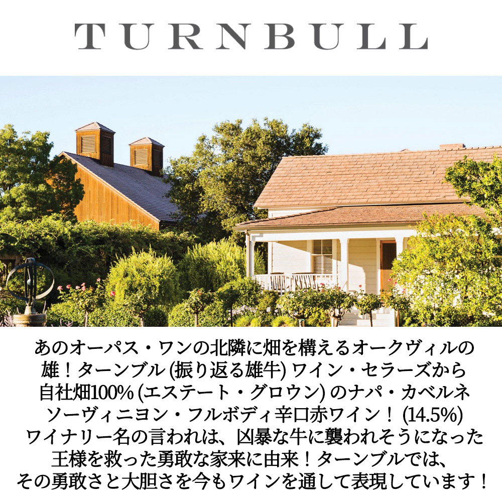 あのオーパス・ワンの北隣に畑を構えるオークヴィルの雄!ターンブル (振り返る雄牛) ワイン・セラーズから自社畑100% (エステート・グロウン) のナパ・カベルネソーヴィニヨン・フルボディ辛口赤ワイン!