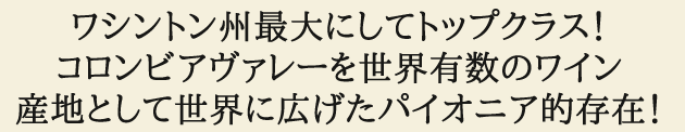 カリフォルニア州に次いで2番目のワイン生産地であるワシントン州は、近年、ワインの質の向上と生産地の拡大で世界的に注目されています。シャトー・サン・ミッシェル(所在地=ワシントン州・ウッディンヴィル)は、1934年に創設されたワシントン州の中では最も歴史のあるプレステージワイナリーです。、ワシントン州東部のコロンビア・ヴァレーを有数のワイン産地として世界に広めたパイオニアとして知られています。「ワインスペクテーター」誌の年間トップ100ワインでは、2007年までの15年間でシャトー・サン・ミシェルから14アイテム、コロンビア・クレストから14アイテムが選出されるなど、ワインプレスやワイン専門家から非常に高い評価を得ています。