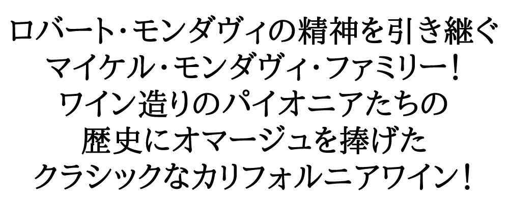 マイケル・モンダヴィ氏は、妻のイザベルと息子のロブ、そして娘のディーナと共に2004年、「マイケル・モンダヴィ・ファミリー・エステート」を設立しました。4世代の情熱と経験を融合させたワイナリーとワインの誕生です。始まりは1919年、マイケル氏の祖父、セザールが禁酒法が施行されている間、合法的に家庭用ワインを作るためにブドウの選考と醸造必需品を揃える役を担ったことに始まります。それにより、カリフォルニアのロディにてモンダヴィ・ファミリーのワイン作りの挑戦が始まったのです。