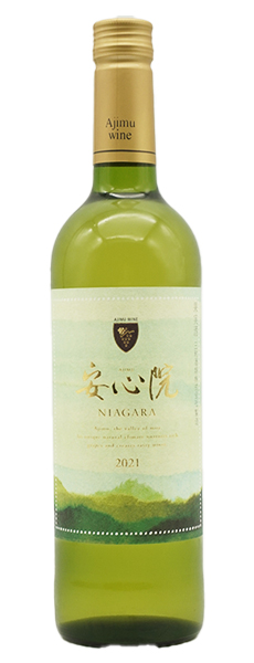 安心院(あじむ)ワイン・ナイアガラ[2021]年 ■ 品種:ナイアガラ種、シャルドネ種(少量) ■ 発酵:ステンレスタンク(低温) 珍しい大分県産やや甘口白ワイン! 安心院ワイナリー農園「あじむの丘農園」で収穫したナイアガラを使用し、少量のシャルドネをブレンドし、ナイアガラ種の特徴的な香りを十分に引き出すため、低温でじっくりとステンレスタンクで発酵させました。 ナイアガラ種は、マスカット香と洋ナシを思わせる香り高い品種で、ほのかな甘さと心地良い酸味がバランスよくとてもフルーティな味わいが特徴! さらにほんのりとシャルドネの味わいが奥深い厚みとなり楽しませてくれる、国産100%のやや甘口白ワイン! 「マツコの知らない世界」でも絶賛され大注目! この機会に是非、ご賞味ください!