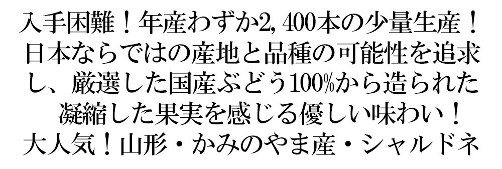 サントリー ジャパンプレミアム 産地シリーズ かみのやま産 シャルドネ 2020年 年産(全世界に)わずか2,400本のみの少量生産!世界を感動させる“日本ワイン”を。日本独自のぶどう「品種」や日本を代表するぶどう「産地」の可能性を追求した国産ぶどう100%のワインシリーズ! ■ぶどう品種:シャルドネ100% 蔵王連峰の裾野に広がる寒暖の差が激しく水はけの良いぶどう栽培に適した山形県上山地区の、しかも日当たりのよい斜面と盆地に拓いた畑で育てられたシャルドネを使用し、醸造・熟成された、果実味豊かな優しい味わいの辛口白ワイン! 大人気ヴィンテージ!醸造長のコメントは、「香りは洋ナシ、砂糖づけのパイナップル、ラムネ、メロンのようなボリュームのある香り。味わいはふくよかでよく熟した果実味が味わいに奥行きを与える。」と絶賛! 洋ナシ、りんごのような果実の甘みを想起させる香りとスズランのような花の香り! 口当たりはやわらかく、中盤からよく熟したぶどう由来のふくよかな果実味が続く、かみのやま産シャルドネが待望の最新ヴィンテージで限定入荷いたしました。