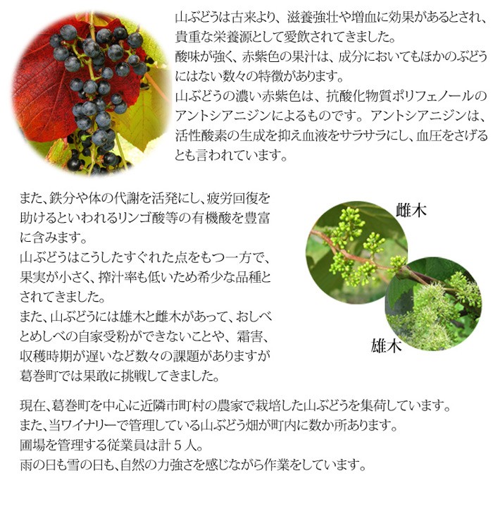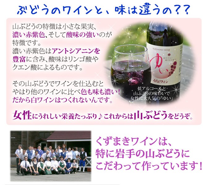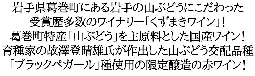 | ■ワインについて | 日本ワイン辛口・赤ワイン愛好家大注目!岩手県葛巻町にある岩手の山ぶどうにこだわったワイナリー「くずまきワイン」!国産ワインコンクール受賞歴多数の美味しいくずまきワイン!葛巻町特産「山ぶどう」を主原料とした国産ワイン!育種家の故澤登晴雄氏が作出した山ぶどう交配品種「ブラックペガール」を主原料として醸造したワイン!野性味を持ちながら気品のある爽やかな酸味とやわらかなタンニンがバランスよく仕上がっている珍しい日本ワインが限定で少量入荷! |