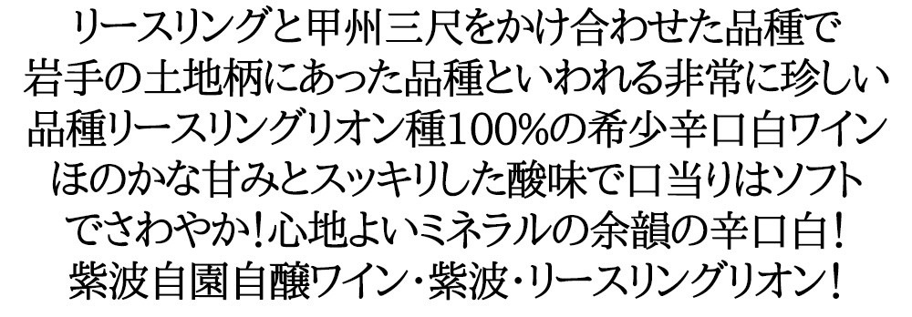 紫波自園自醸ワイン 紫波(しわ) N.V 【タイプ】 白・やや辛口 【酸味】 程よい 【アルコール分】 10度 【葡萄品種】 リースリングリオン 【葡萄産地】 岩手県紫波町 【瓶栓種】コルク栓 【商品特徴】 青りんごや柑橘系のフルーツの香りがあり、ほのかな甘みとスッキリとした酸味で、口当たりはソフトで爽やかです。 白身魚、海老フライ、天ぷらとの相性も良好。夏にはきりっと冷やして、塩ゆでした枝豆にもおすすめ。