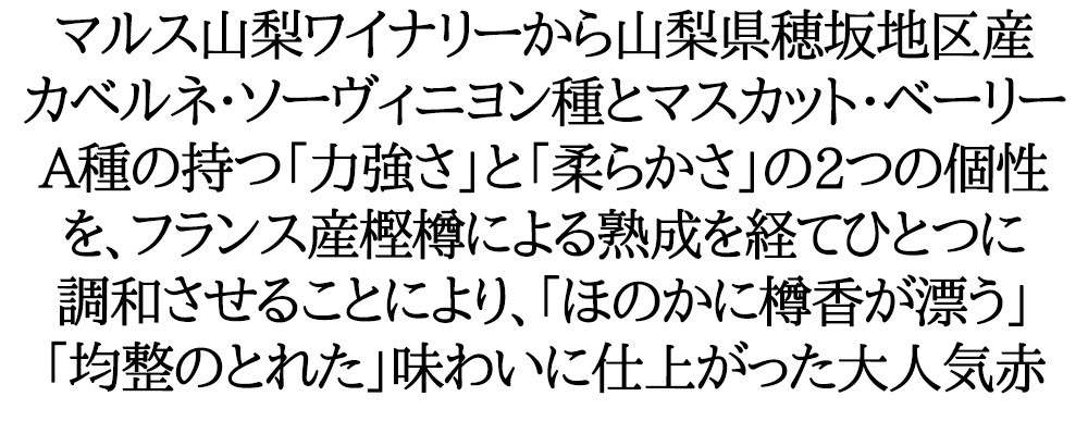 シャトー マルス 穂坂プレミアム カベルネ ベーリーA 収穫 2021年 山梨県韮崎市穂坂地区は、三角形をした甲府盆地の北西側 の角から立ち上がる広大な茅ヶ岳山麓に位置する、県内を 代表するワイン醸造葡萄の産地です。標高400~700mの山麓南西斜面は、「日照時間」が長く「少雨冷涼気象区」に属し、「裾野を駆ける風」や「やや粘性のある土壌」がもたらす自然環境から育まれる葡萄は、「凝縮度が高く」「腰の強い」味わいのものとなります。穂坂産甲州種の個性を最大限に引き出すため、厳密な発酵管理 を行ない、フランス産樫樽で熟成させることにより、「ほのかに 樽香が漂う」「ふくよかな味わい」のやや辛口ワインを醸造しました。「シャトーマルス 甲州穂坂収穫」は、マルスワインの技術に 裏付けられた甲州ワインの逸品です。 若々しい外観からは、樽由来の薄い麦わら色を帯び全体に淡いイエロー。ナシ、かすかに柿の葉といった香に、白い花の香、樽からのほのかなナッツ香。調和のとれた柔らかさを感じさせる香りが特徴。まろやかで、ふくらみのある味わいが、引き締まった酸味とバランス良く調和して、樽に溶け込んだ印象。余韻には、樽に由来する心地よい渋味が残ります。