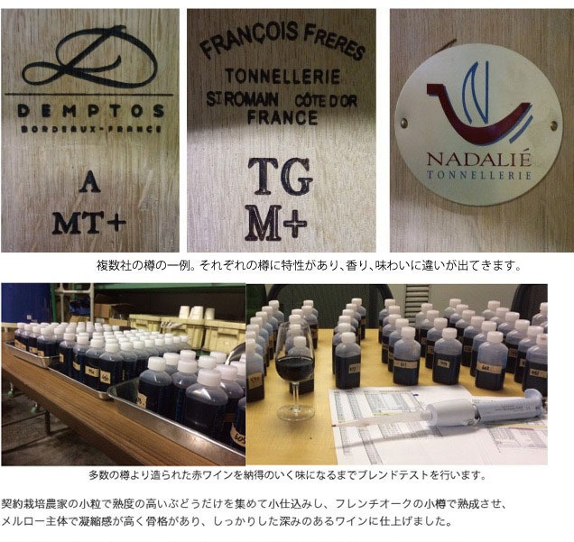 高畠ワイナリーでは厳しい独自基準をもうけ、契約栽培家と共に妥協のないブドウの栽培を行っております。年々、技術も向上し、良質のぶどうがとれるようになってきました。そこで、2013ヴィンテージから良いぶどうだけを小ロットで集め、質の高いワインを製造するというプロジェクトがスタートしました。そのプロジェクトが『majestigue~マジェスティック~』。そこで生まれたのが「青おに」こと、ローグルブルーという赤ワインです高畠ワイナリーでは、樽にもこだわりワイン造りを行っております。樽の香りや味わいにも深みを出すために、複数社の樽を選別し、使用しております。例えば、ナダリエ社の樽からは、バニラのような甘いトースト香が、フランソワフレール社の樽からは、キャラメルのような香ばしい香りが、デントス社の樽からは、コーヒーやビターチョコのようなスパイシーな香りや味が付加されます。そうした特性をブレンドすることにより、複雑性をもたらし、味わいに幅を持たせます。