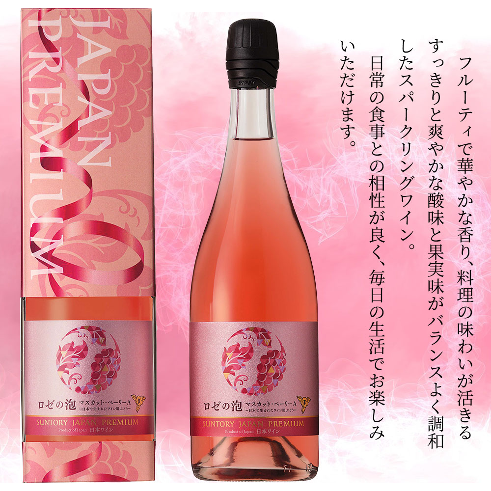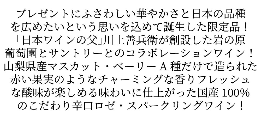 【箱入】ロゼの泡・マスカット・ベーリーA・ロゼ・スパークリングワイン・サントリー・ジャパンプレミアム・日本ワイン・ロゼ・泡・母の日 ■ぶどう品種:山梨県産マスカット・ベーリーA種 この「ロゼの泡・マスカット・ベーリーA・ロゼ・スパークリングワイン」は、岩の原葡萄園とサントリーの共同開発した限定生産品! 山梨県産マスカット・ベーリーA種だけで造られた赤い果実のようなチャーミングな香りフレッシュな酸味が楽しめる味わいに仕上がった国産100%のこだわり辛口ロゼ・スパークリングワイン! チャーミングでフルーティな香り、すっきりとした爽やかな酸味と、自然な甘味のバランスが心地よい味わい! 国産マスカット・ベーリーA・ロゼ・スパークリングワイン! プレゼントにふさわしい華やかさと日本の品種を広めたいという思いを込めて誕生した超限定生産ロゼスパークリングが贈り物にも最適な専用箱入り!