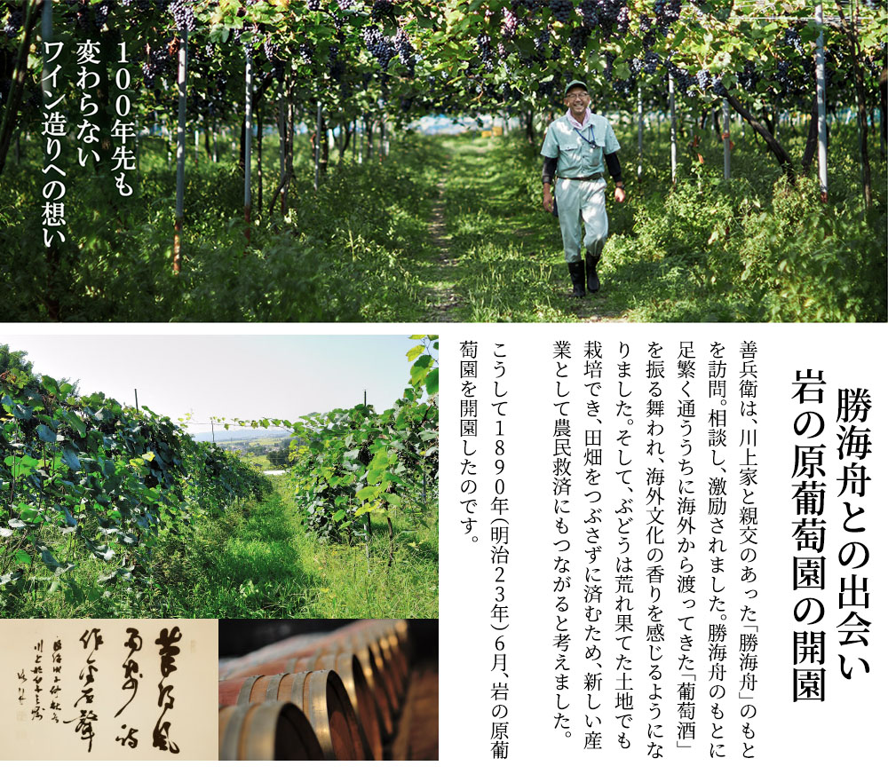 日本のワインぶどうの父と呼ばれる岩の原葡萄園創業者「川上善兵衛」は、地元地域の発展を常に考え、そして1890年(明治23年)に岩の原葡萄園を開設します。その後、本格的なワイン造りを追求し続け、当地の気候風土に適したぶどうを求め品種改良に挑み、1万311回の品種交雑を行いその中から「マスカット・ベーリーA」をはじめとする優良22品種を世に送り出しました。以来、そのぶどうも世の中に知れ渡り現在では多くのワイン愛好家によって飲まれています。
