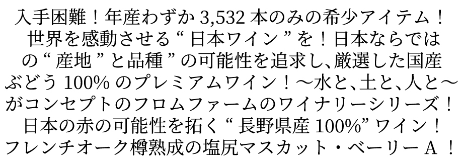 塩尻マスカット ベーリーA 2020 限定生産品 長野県塩尻市産100%&マスカット ベーリーA100% サントリー ワイナリー シリーズ 長野県 ■ぶどう品種:長野県産マスカットベーリーA100% ■発酵・熟成:フレンチオーク樽熟成 ■土壌:火山性土壌 ■標高:700m 国産ワインが大人気!国産マスカットベーリーA100%辛口赤ワイン!日本の赤の可能性を拓く“長野県産100%”ワイン! 1936年開設以来、日本人の嗜好に寄り添って、「赤玉」をはじめ日本の赤ワインの歴史を切り拓いてきた塩尻ワイナリー! 豊かな果実香にスパイスやハーブの香りが調和した凝縮感のある赤ワイン!
