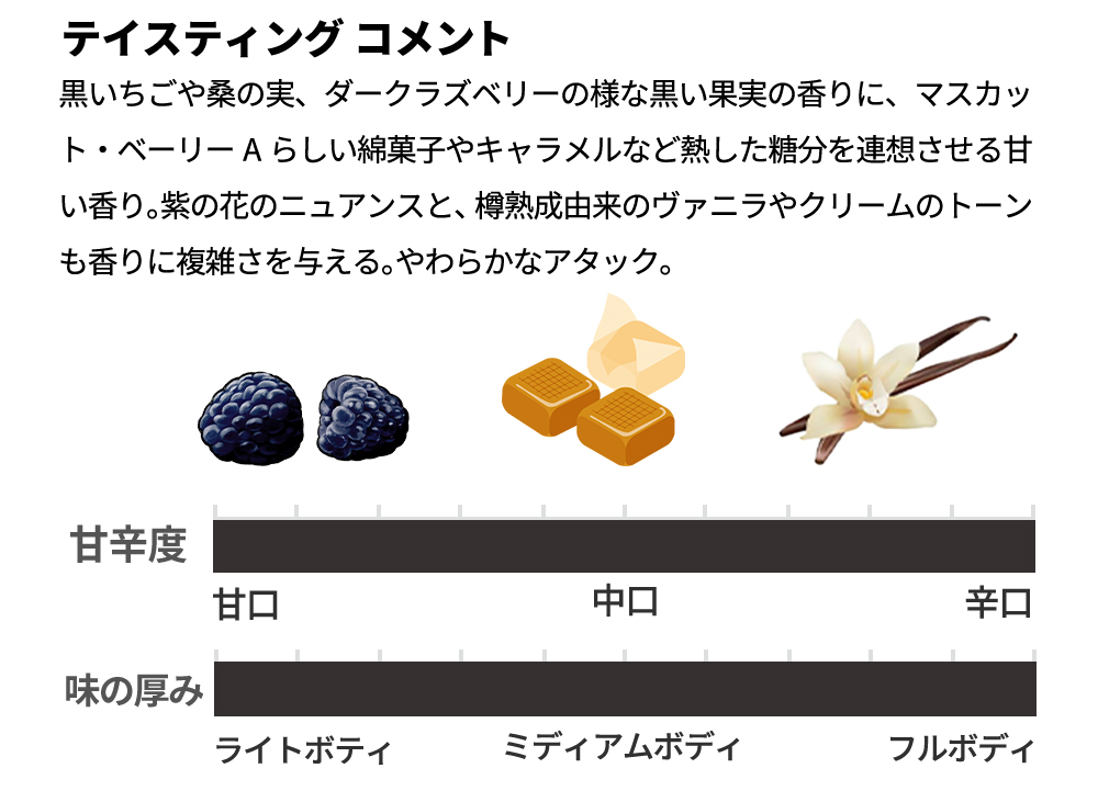 長野は山梨と並ぶ日本における二大ワイン産地。中でもメルロ、マスカット・ベーリーAなど、赤ワイン用ぶどうの品質の高さは格別です。この地に1936年開設以来、日本人の嗜好に寄り添って、「赤玉」をはじめ日本の赤ワインの歴史を切り拓いてきた塩尻ワイナリー。地元のぶどう農家の方々と手を携え、日本の赤ワインのさらなる可能性を拓く、長野県産ぶどう100%ワインです。