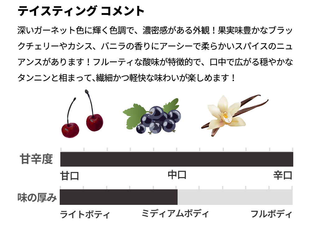 深いガーネット色に輝く外観と果実味豊かな香りが特徴で、フルーティな酸味と穏やかなタンニンが織り成す繊細かつ軽快な味わいが楽しめます。